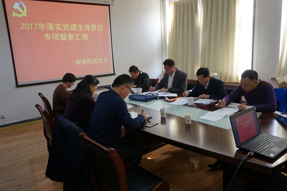 首先,學(xué)院黨總支書記王新向督查組匯報了黨總支2017年黨建工作。她重點圍繞黨總支書記抓基層黨建突破項目進(jìn)展情況和“三結(jié)合”黨建品牌,從學(xué)習(xí)宣傳貫徹黨的十九大精神情況;層層壓實主體責(zé)任,充分發(fā)揮政治核心作用;學(xué)做結(jié)合,扎實推進(jìn)“兩學(xué)一做”學(xué)習(xí)教育常態(tài)化、制度化;確保黨員發(fā)展規(guī)范化、制度化,進(jìn)一步強(qiáng)化黨員教育管理;立足黨建品牌和特色,推動學(xué)科和學(xué)院發(fā)展,為思政和黨建工作注入持久活力等五個方面進(jìn)行了詳細(xì)匯報。隨后,督查組逐一認(rèn)真查閱了會議記錄、會議紀(jì)要、學(xué)習(xí)計劃和記錄、“三會一課”計劃、學(xué)生黨員發(fā)展等相關(guān)資料。最后,張殿恒進(jìn)行了現(xiàn)場反饋點評。他充分肯定了我院匯報材料和支撐材料的詳實和規(guī)范,并對黨建工作提出要求和希望。他強(qiáng)調(diào),一是,扎實落實好黨政聯(lián)席會議制度,切實夯實黨建主體責(zé)任;二是,堅持黨建統(tǒng)領(lǐng)業(yè)務(wù)、業(yè)務(wù)促進(jìn)黨建原則,黨建工作圍繞學(xué)院中心工作,切實促進(jìn)科研、教學(xué)和學(xué)生教育管理工作;三是,認(rèn)真總結(jié)黨建工作中存在的不足,查補(bǔ)短板,以黨建督查為契機(jī),進(jìn)一步做好相關(guān)整改工作。