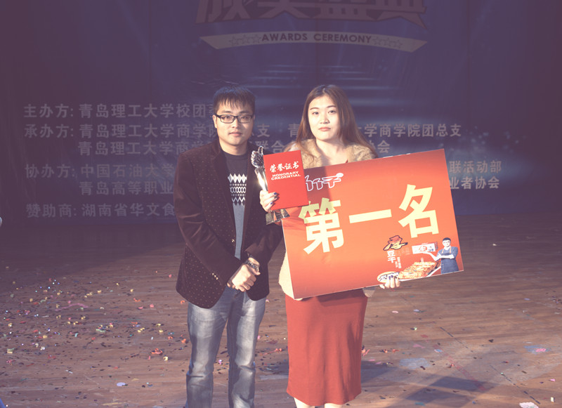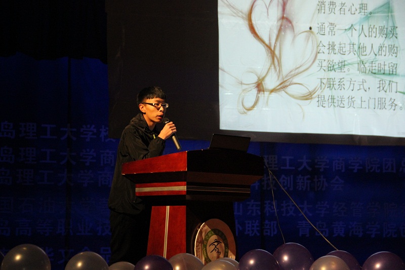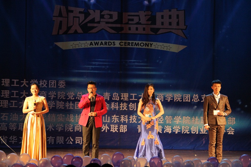 晚7點(diǎn), 頒獎(jiǎng)典禮正式開(kāi)始。首先是大賽回顧,精心制作的視頻記錄了大賽從前期策劃、宣傳,到啟動(dòng)、展開(kāi)的整個(gè)歷程,一張張圖片展示了大賽的精彩與難忘瞬間,短短幾分鐘的視頻也蘊(yùn)含了參賽選手和組織者近一個(gè)月努力與付出。接下來(lái),是優(yōu)秀團(tuán)隊(duì)展示環(huán)節(jié),來(lái)自青島職業(yè)技術(shù)學(xué)院的瘋狂銷(xiāo)隊(duì)、檸檬水隊(duì)和中國(guó)石油大學(xué)的翼豐隊(duì)分別介紹了各自的感受與收獲,他們?cè)赑PT中圖文并茂,全面系統(tǒng)地闡述了各自的參賽思路、營(yíng)銷(xiāo)策略、團(tuán)隊(duì)分工、銷(xiāo)售歷程、創(chuàng)新之處和心得收獲,遇到困難時(shí)的堅(jiān)持贏得了觀(guān)眾的陣陣掌聲,銷(xiāo)售成果的展示也獲得了觀(guān)眾的拍手叫好。隨后,我院市場(chǎng)營(yíng)銷(xiāo)系主任胡保玲副教授對(duì)各團(tuán)隊(duì)進(jìn)行了點(diǎn)評(píng),他肯定了參賽學(xué)生積極參與創(chuàng)新實(shí)踐活動(dòng)的態(tài)度,也贊嘆了各團(tuán)隊(duì)所表現(xiàn)出的深厚營(yíng)銷(xiāo)知識(shí)和高超營(yíng)銷(xiāo)技能,并祝愿同學(xué)們堅(jiān)定目標(biāo),越走越遠(yuǎn)。接下來(lái),本屆大賽贊助商湖南華文食品有限公司漆云波先生在發(fā)言中感謝青島理工大學(xué)為本屆大賽圓滿(mǎn)成功所做的工作,對(duì)各參賽團(tuán)隊(duì)在比賽中的優(yōu)異表現(xiàn)表示贊賞,并希望未來(lái)能夠加深合作。隨后是頒獎(jiǎng)環(huán)節(jié),我院V5隊(duì)、山東科技大學(xué)新秀隊(duì)和青島職業(yè)技術(shù)學(xué)院瘋狂銷(xiāo)隊(duì)三支團(tuán)隊(duì)獲得三等獎(jiǎng),獎(jiǎng)金500元,任孔冰老師為其頒獎(jiǎng);我院暖仔隊(duì)和中國(guó)石油大學(xué)翼豐隊(duì)獲得二等獎(jiǎng),獎(jiǎng)金1000元,胡保玲副教授教授為其頒獎(jiǎng);本屆大賽一等獎(jiǎng)最終被青島職業(yè)技術(shù)學(xué)院的檸檬水隊(duì)獲得,獎(jiǎng)金1500元,贊助商代表漆云波先生為其頒獎(jiǎng)。最后,全體人員合影留念,頒獎(jiǎng)典禮圓滿(mǎn)結(jié)束。