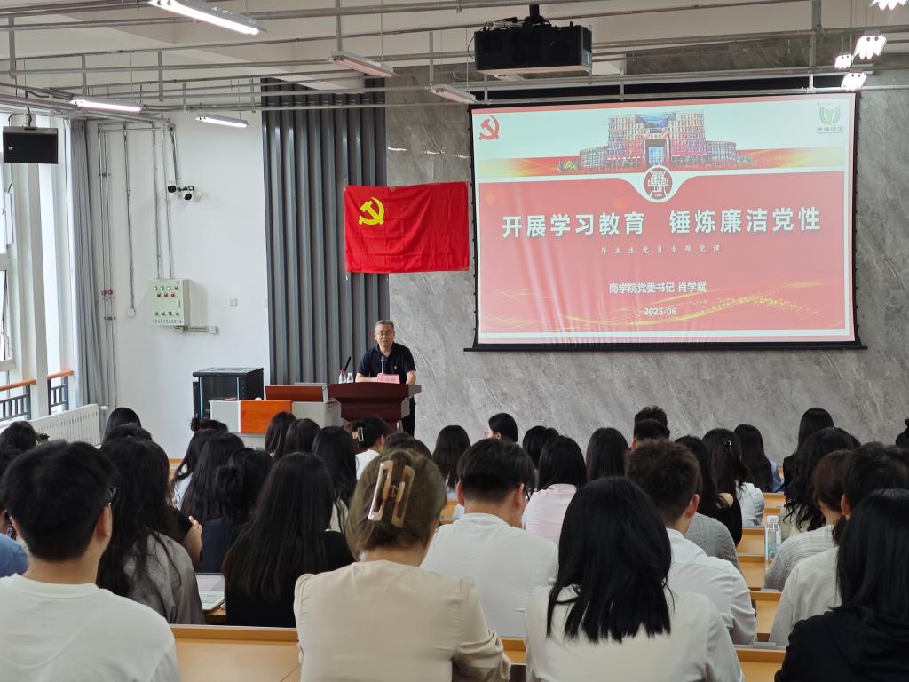 鑄魂賦能,黨性教育筑牢信仰之基。商學(xué)院黨委書記肖學(xué)斌以“開展學(xué)習(xí)教育,錘煉廉潔黨性”為主題,為畢業(yè)生黨員帶來一堂兼具理論高度與實(shí)踐深度的專題黨課。肖學(xué)斌以鮮活案例與殷切囑托,勉勵(lì)畢業(yè)生黨員在新征程中勇做追夢者、奮斗者與廉潔表率。他向每位黨員贈(zèng)送“紅心續(xù)航箋”,這份承載著入黨誓詞、激勵(lì)箴言與校徽印記的特殊禮物,不僅是畢業(yè)留念,更成為敦促黨員終身錘煉黨性的“精神火種”。