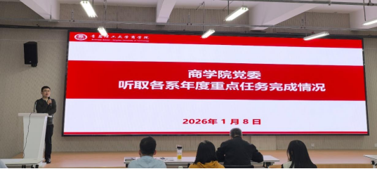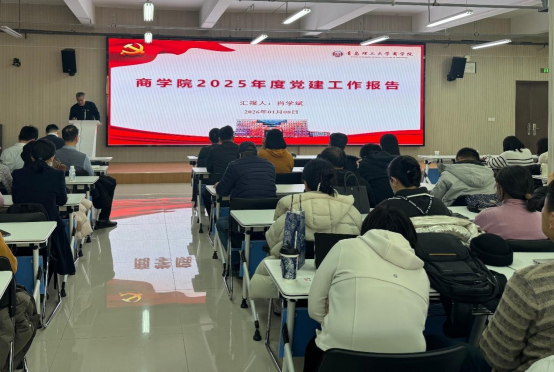 為進(jìn)一步加強(qiáng)基層黨組織建設(shè),激發(fā)全院干事創(chuàng)業(yè)熱情,1月8日,商學(xué)院在學(xué)院401報(bào)告廳開展2026年黨員大會(huì)暨黨支部書記、系主任年度工作匯報(bào)會(huì)。會(huì)議由學(xué)院黨委書記肖學(xué)斌主持,學(xué)院全體教師黨員及部分學(xué)生黨員代表參加會(huì)議。