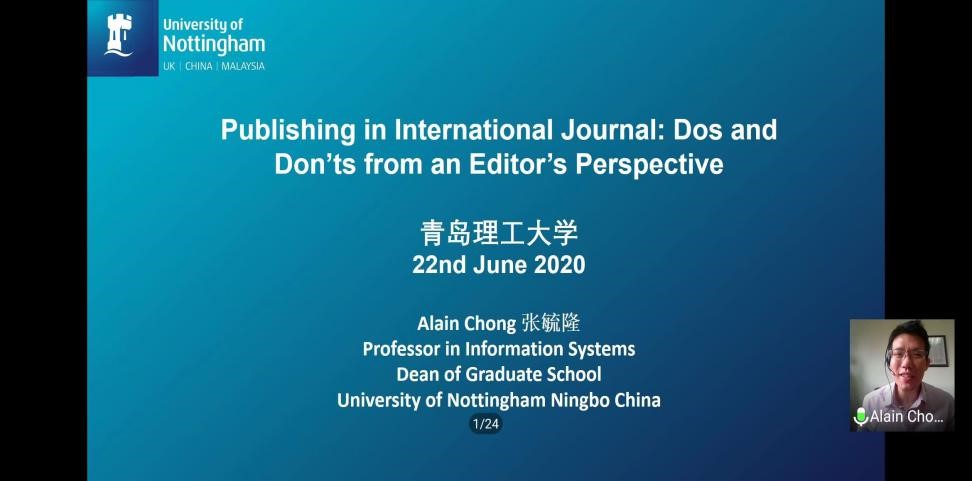 6月23日下午,商學院舉辦西海岸商學論壇弘商講堂(第14講)學術(線上)講座。本次講座邀請寧波諾丁漢大學研究生院院長、博士生導師張毓隆教授擔任主講,宣講主題為“國際期刊出版的應做與不應做”。商學院副院長云樂鑫教授及校內(nèi)外師生聆聽本次講座,電子商務教研室朱文龍副教授主持本次講座。