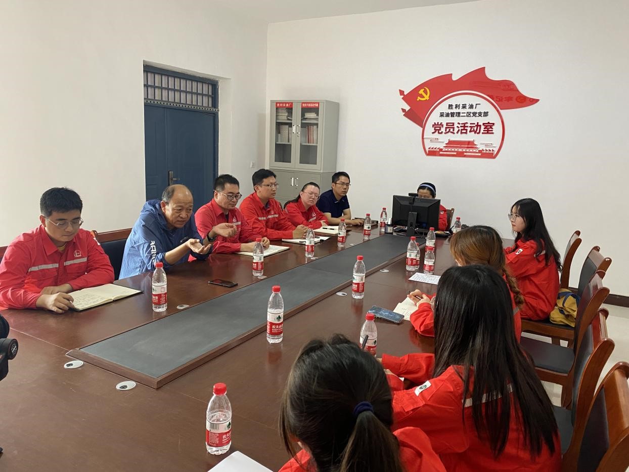 在黨史故事中探尋石油精神底色:7月24日,團(tuán)隊(duì)成員在勝利采油廠(chǎng)采油管理二區(qū)黨支部黨員活動(dòng)室中傾聽(tīng)感動(dòng)石化人物、勝利油田勝利采油廠(chǎng)采油管理二區(qū)注采201站黨支部書(shū)記王友忠講述黨史故事。“我從保家衛(wèi)國(guó)的第一線(xiàn)來(lái)到建設(shè)祖國(guó)的前線(xiàn),我將永遠(yuǎn)感到自豪”,“共產(chǎn)黨員就是群眾的主心骨,唯一的特權(quán)是帶頭吃苦”,“石油精神中體現(xiàn)著偉大建黨精神,從‘三老四嚴(yán)’到新舊動(dòng)能轉(zhuǎn)換,石油人永遠(yuǎn)勇于自我革命,石油精神永遠(yuǎn)朝氣蓬勃。”一個(gè)個(gè)黨史故事和一句句樸實(shí)話(huà)語(yǔ)深刻打動(dòng)了實(shí)踐團(tuán)隊(duì)成員,令在座人員動(dòng)容。隨后,在油田工作的畢業(yè)大學(xué)生們向成員分享自己扎根基層的工作感悟,以及石油精神在自己的工作與生活中的體現(xiàn),讓團(tuán)隊(duì)成員看到了油田人的自信和擔(dān)當(dāng)。團(tuán)隊(duì)成員李雨澤聽(tīng)后激動(dòng)地說(shuō)道:“一輩又一輩石油人將自己的青春與熱血奉獻(xiàn)給石油,奉獻(xiàn)給祖國(guó),這種飽含風(fēng)險(xiǎn)和熱血的紅色就是石油精神的底色,值得我們欽佩和學(xué)習(xí)!”